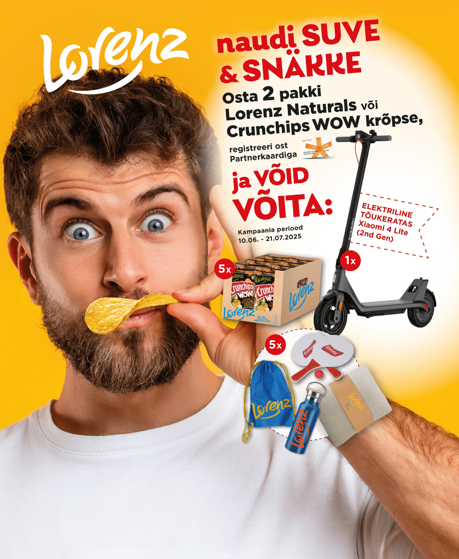 1. Kõik Kampaanias osalejad, kes on täitnud punktis 4 nimetatud tingimuse ja kellel on püsikliendi andmebaasis korrektselt täidetud kõik andmeväljad osalevad loosimises, milles loositakse välja 1x Xiaomi 4 Lite (2nd Gen) elektriline tõukeratas, 5x kast Crunchips WOW krõpse (maitse võitja soovil), 5x rannakomplekt (Rannakott, Rannapalli komplekt, Lorenz metallist joogipudel, Taaskasutatud plastist rannalina). Kokku loositakse 11 auhinda. Oma Partnerkaardi andmebaasis olevaid andmeid saab kontrollida ja uuendada iseteeninduses: www.partnerkaart.ee